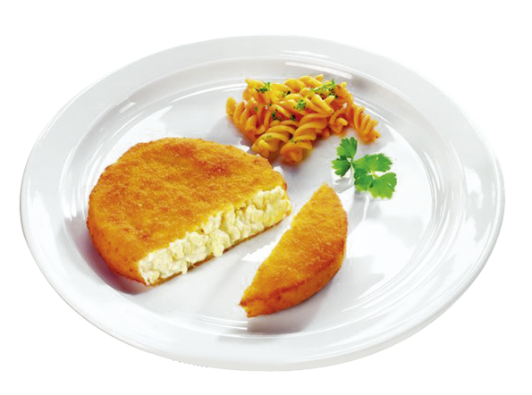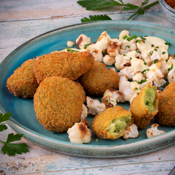 Bratling aus Blumenkohl mit herzhaftem Gouda, umhüllt von einer Knusperpanade. Vegetarisch. Einzeln entnehmbar.
