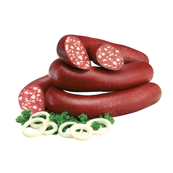 Im Geschmack herzhaft-aromatisch. In Naturdärme gefüllt, mit Buchenholz überräuchert. Kalt und Warm (gebraten in der Pfanne) ein Genuss. Dazu frische Bratkartoffeln. Kaliber 40.