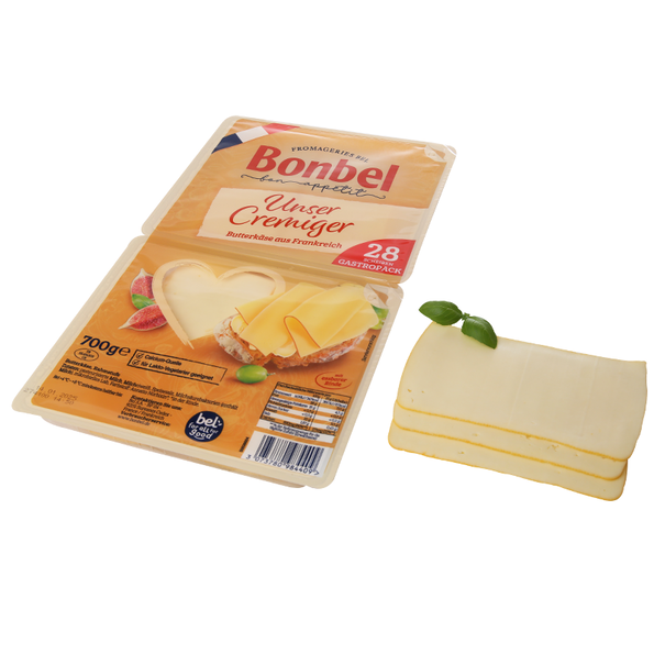 Französischer halbfester Schnittkäse. Unbeschreiblich zart und voll im Geschmack, das ist Bonbel, der französische Butterkäse. Nach bester Bonbel-Tradition in der Brotform gereift und dann in delikate Scheiben geschnitten. Er bleibt lange frisch, stabil und appetitlich. Essbare Rinde. Laktosefrei.