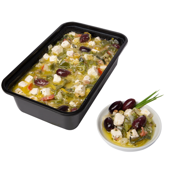 Würziger Würfelkäse mit frischem Gemüse und schwarzen Oliven abgerundet. Auslaufsicher versiegelt.