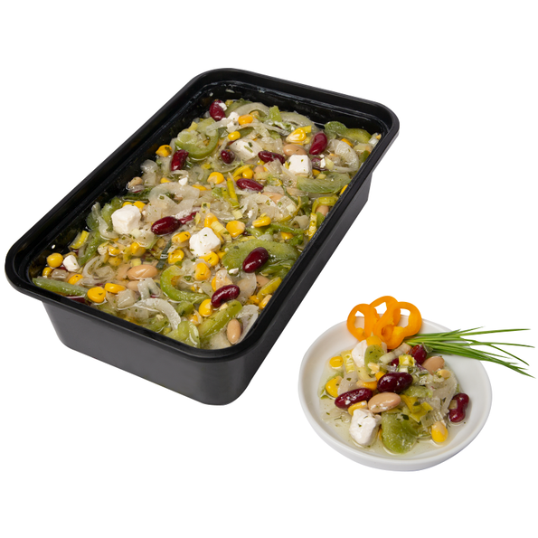 Mit Kidney Bohnen, Mais, Paprika und Kuhmilchweißkäse. Auslaufsicher versiegelt.