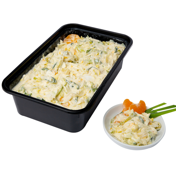 Porreestreifen, frische Äpfel, Sellerie, süße Ananas, Eier und Mandarinen in einem herzhaft fruchtigem Sahnedressing. Auslaufsicher versiegelt.
