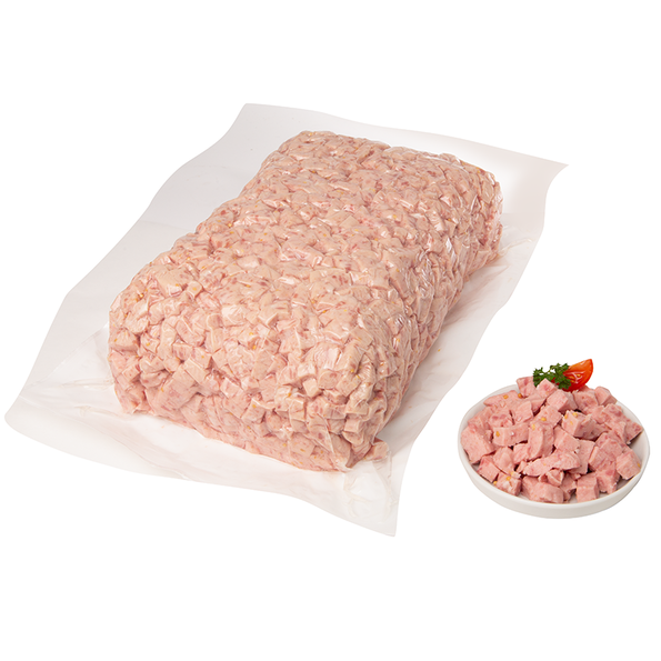 Jagdwurst norddeutsche Art. Fein zerkleinertes Brühwurstbrät mit Fleisch- und Senfeinlage, in 1 x 1 cm Würfel geschnitten.
