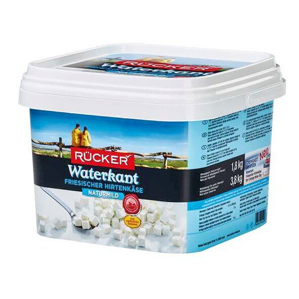 Aus Kuhmilch hergestellt. Würfelgröße: ca. 14 mm. Füllgewicht: 3,80 kg, Abtropfgewicht: 1,80 kg.