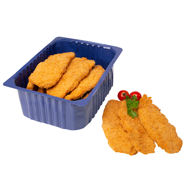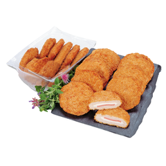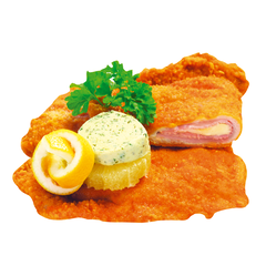 Hähnchenformfleisch nach Art "Cordon Bleu", aus Hähnchenbrustfleischstücken zusammengefügt, gefüllt mit einer Schmelzkäsezubereitung und Putenformkochschinken. Paniert und gebraten.