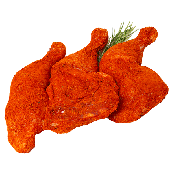Saftig-würzige Hähnchenschenkel mit Rückenstück herzhaft gewürzt.