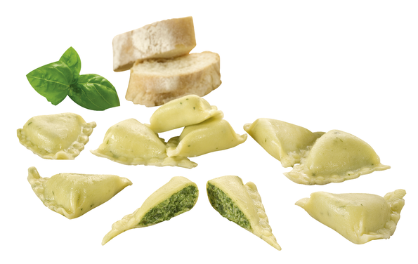 Teigware mit einer cremigen Füllung (50 %) aus Blattspinat und Crème Fraiche. Stückgewicht 12 g. Einzeln entnehmbar.
